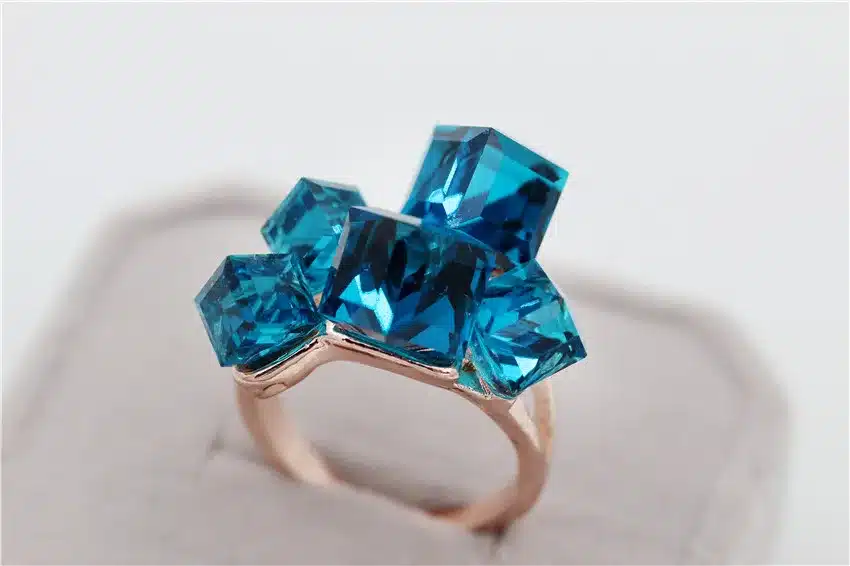 Elegantne sõrmus, mis tõmbab tähelepanu oma säravate siniste kuubikujuliste kividega, lisades igale riietusele sära.